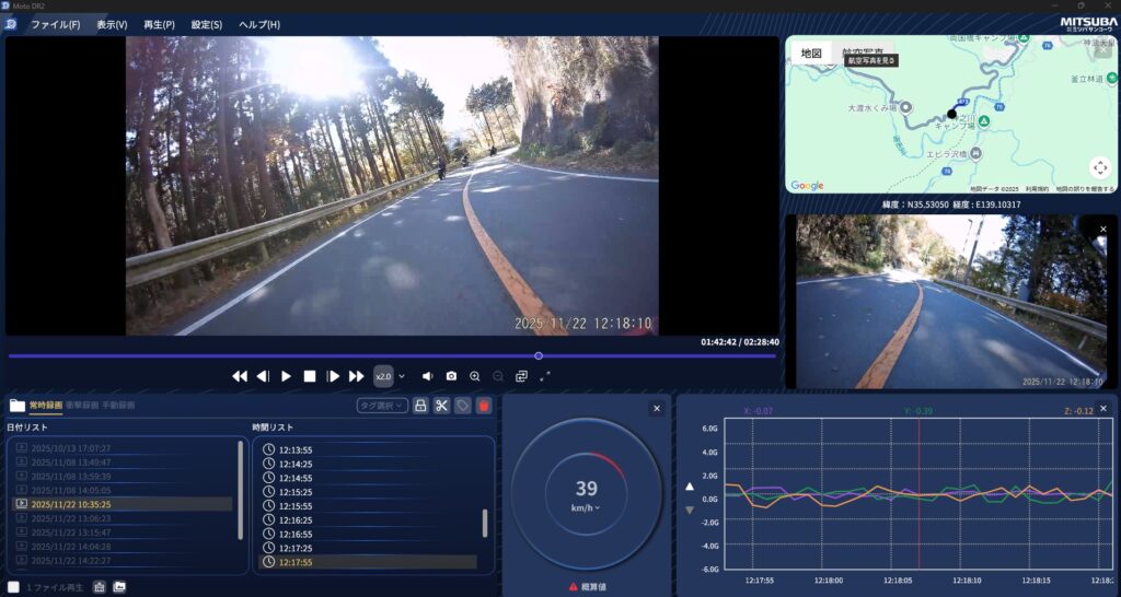 上の写真がMotoDR2の操作画面ですが、前後カメラの映像と走っている位置や速度に