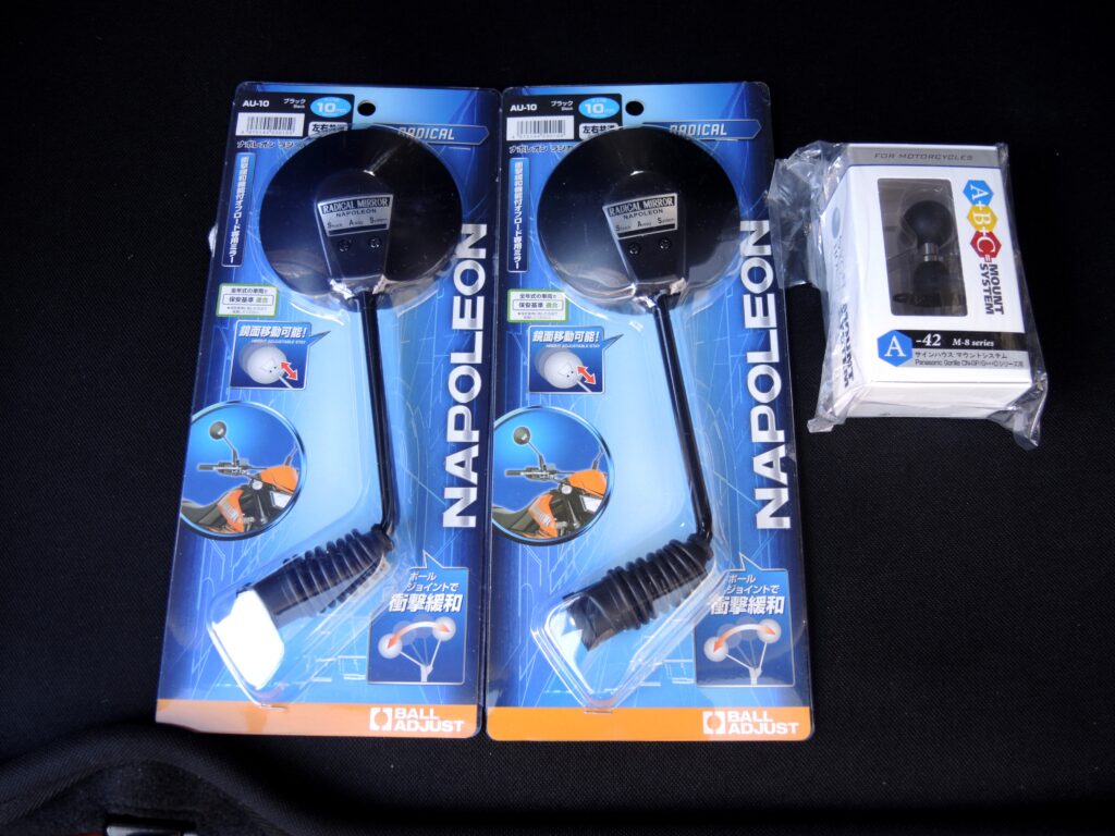 用意したのは、タナックスのナポレオンミラーとサインハウスのナビマウントA-42