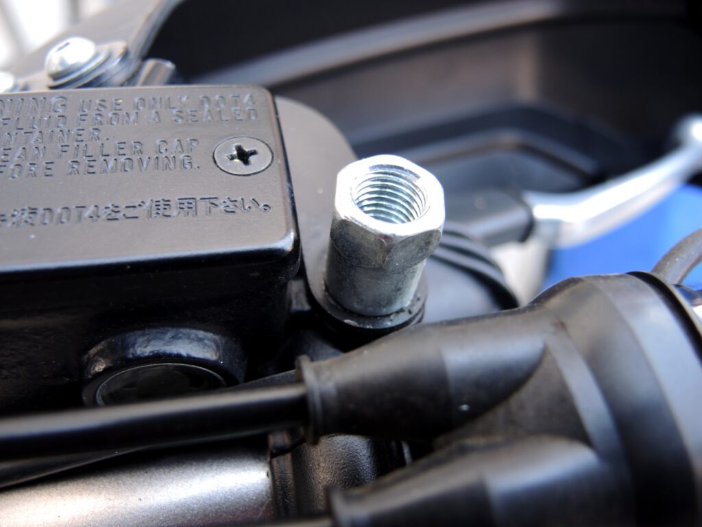 右側のミラー穴には逆ネジ用のアダプタが入っていましたので、このまま流用します