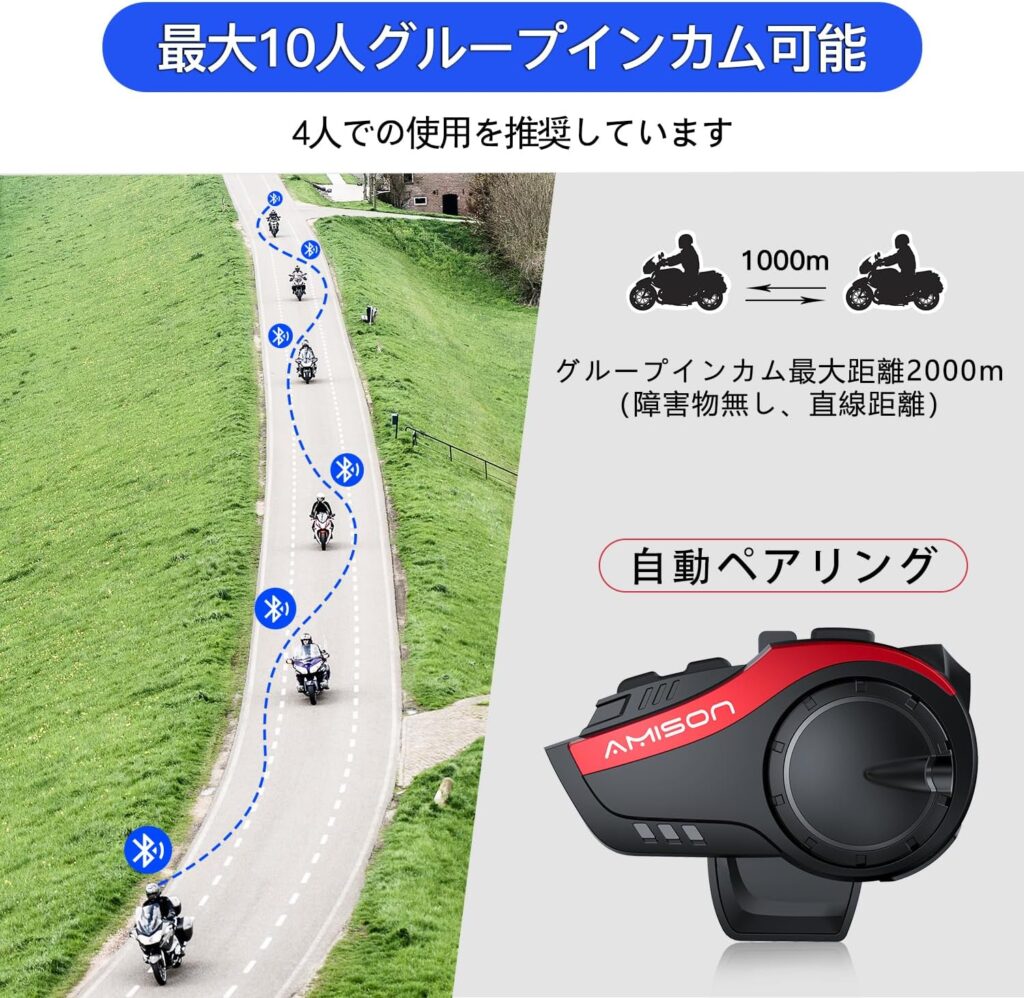 Amison バイクインカム 最大10人同時通話 最大通話距離2000m Bluetooth5.0 FMラジオ付 (Amazon)